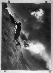 Riproduzione fotografia raffigurante alpinista su parete verticale di ghiaccio