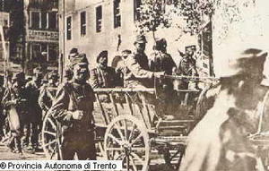 - TRENTO. PIAZZA FIERA. TRASPORTO DI CESARE BATTISTI DOPO L'ARRESTO. 1916 LUG. 10