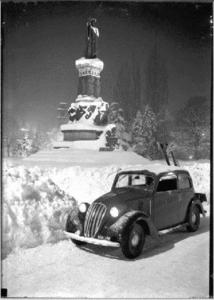 Trento, P.zza Dante, Monumento a Dante, autovettura in transito, veduta notturna con neve