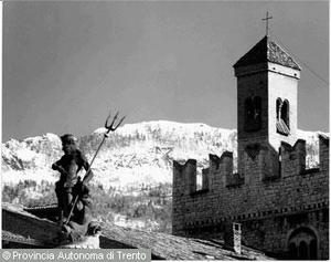- Trento / Piazza Duomo / Particolare sommitale della fontana del Nettuno sullo sfondo del campanile di S. Romedio e la Marzola innevata