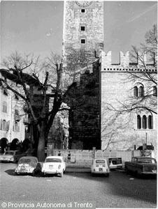 - Trento / Piazza Duomo / Scorcio della Torre Civica e del Palazzo Pretorio; veicoli parcheggiati