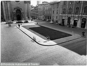Trento / Piazza S. Maria Maggiore / Veduta dell'aiuola spartitraffico sullo sfondo della facciata della chiesa
