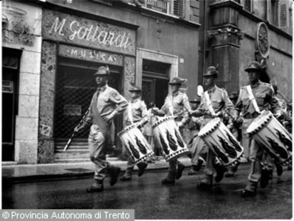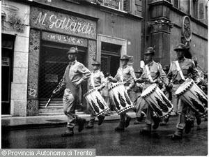 Trento, via Manci, banda musicale degli alpini sfila durante un raduno