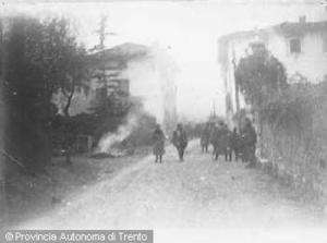 VEDUTA DI UNA VIA DI PAESE, IN PRIMO PIANO UOMINI IN DIVISA. 1918-1920
