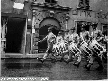 F.lli Pedrotti (1929 - 1979)Trento, via Manci, banda musicale degli alpini sfila durante un raduno
