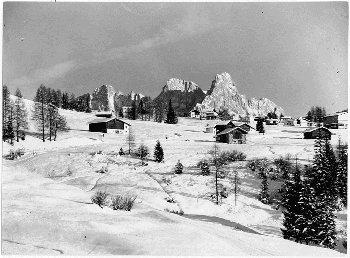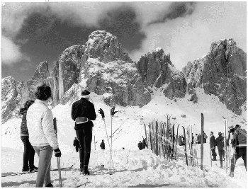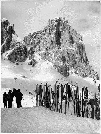 F.lli Pedrotti (1929 - 1979)Dolomiti / Col Rodella / Sciatori presso il rifugio sullo sfondo del Gruppo del Sella