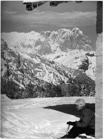 F.lli Pedrotti (1929 - 1979)Dolomiti / Escursionista seduta presso una baita sullo sfondo del Gruppo del Sassolungo innevato
