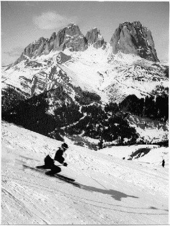 F.lli Pedrotti (1929 - 1979)Dolomiti / Sciatore in azione su una pista sotto il Sassolungo