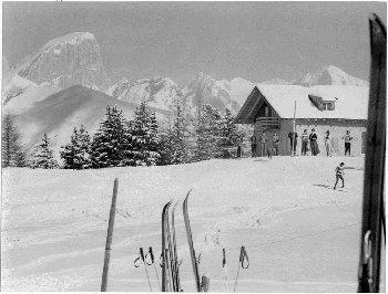 F.lli Pedrotti (1929 - 1979)Dolomiti / Sciatori in sosta presso un rifugio sullo sfondo della Marmolada