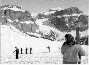 F.lli Pedrotti (1929 - 1979)Dolomiti / Sciatori si accingono a scendere lungo le piste del Passo Pordoi sullo sfondo dei...